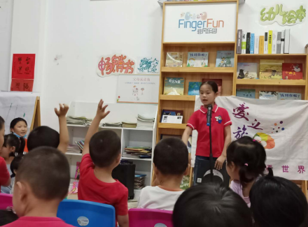 隨后,霍蕾伊下課后匆匆趕來,給小觀眾們帶來了第二個故事《大腳丫和高跟鞋》。在幾乎沒有彩排的情況下,她直接上場抑揚頓挫地講完了整個文字豐富、情節(jié)生動的故事。講解中,霍蕾伊特別投入,由于天氣炎熱,兩頰的汗都滴下來了,也顧不得擦拭,力求把故事講好、講完。無論臺下多么混亂、嘈雜,蕾伊小姐姐都能從容應(yīng)對,繼續(xù)講解自己的故事,直到場面恢復(fù)到正常。結(jié)束后,小朋友們也紛紛登臺,爭當(dāng)社區(qū)“領(lǐng)讀者”。