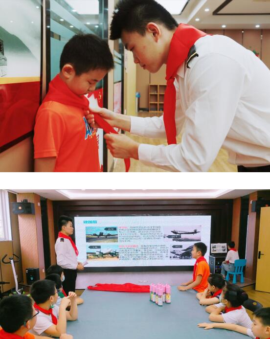 現(xiàn)場,志愿者通過播放視頻和現(xiàn)場講解,讓孩子們了解了“紅領(lǐng)巾”所代表著的深刻內(nèi)涵,感悟愛國主義精神,樹立投身祖國國防事業(yè)的理想。同時,來自南京航空航天大學(xué)飛行技術(shù)專業(yè)的飛行學(xué)員林童身穿飛行制服,為社區(qū)的孩子們佩戴上了紅領(lǐng)巾,并細(xì)致地講解正確的紅領(lǐng)巾佩戴過程。隨后,飛行員向孩子們講述了國防科技與我國航空航天事業(yè)的發(fā)展史,講述一代代中國航空、航天人的科研事跡,孩子們紛紛用畫筆在紙上畫出了屬于自己的“小飛機(jī)”,并一筆一劃地簽上了自己的名字。并表示長大了想當(dāng)科學(xué)家,制造出更厲害的飛機(jī)!