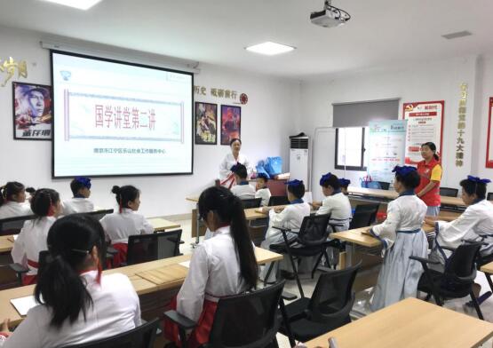 “端身正立,兩臂稍彎,十指并攏,拇指內(nèi)扣,雙手相疊于胸前,男生左手在上,女生反之……此為拱手禮”,活動開始,在國學老師的引導下,大家一步一步地跟著練習起來;“右手成拳,表示勇猛,左手為掌,表示德、智、體、美齊備,屈拇指表示不自大,左掌心按貼右拳面,左指尖與下顎平齊……此為抱拳禮。”志愿者帶領(lǐng)孩子們學習了平輩之間互敬所使用的拱手禮和抱拳禮。在充分掌握兩種禮儀的表現(xiàn)方式后,孩子們興高采烈地兩兩互敬,學著古人打起招呼來,在這邊一句“久仰久仰!”,在那邊一句“幸會幸會!”的氛圍中,志愿者和孩子們跟著老師誦讀起國學詩經(jīng)《小星》……青少年們認真地大聲朗讀,朗朗的讀書聲回蕩在課堂里。現(xiàn)場秩序十分良好,青少年們都全心投入到了活動中。在活動結(jié)束后,志愿者對部分參與者進行了回訪,參與的青少年說道,雖然對一些句子的含義不能深入理解,但在閱讀的過程中能夠認識很多生字,已經(jīng)是很大的收獲了。
