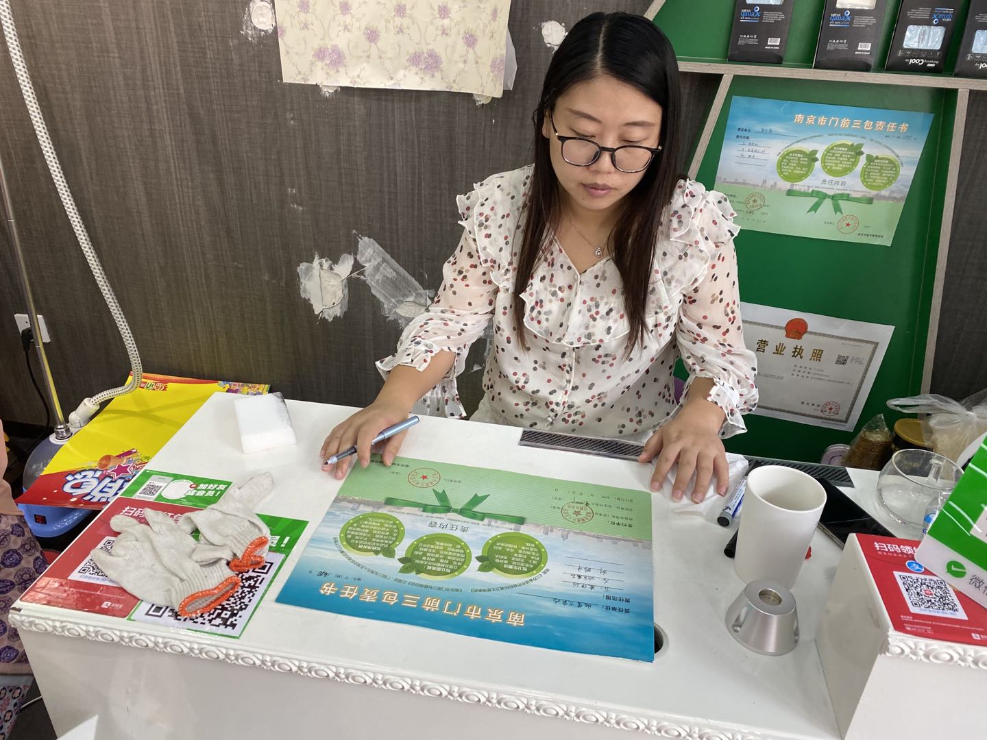 檢查中工作人員發(fā)現(xiàn)部分商家雖然前期已經(jīng)簽訂了“門(mén)前三包”責(zé)任書(shū),但只隨手丟在抽屜里并沒(méi)有張貼上墻,更有的店家前期簽訂的責(zé)任書(shū)已遺失。針對(duì)此情況,工作人員立即為這些店家補(bǔ)簽“門(mén)前三包”責(zé)任書(shū),并告知其要張貼于店鋪醒目處并妥善保管。