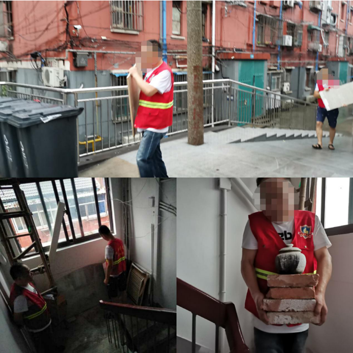 早上8點鐘多一點,天空還在下著大雨,我們的矯正人員就按照約定時間提前來到社區(qū)門衛(wèi)等待,人齊之后冒雨到小區(qū)樓棟清理雜物。在社區(qū)工作者的帶領(lǐng)下,身穿志愿者紅馬夾的他們,樓上樓下,一趟又一趟,一單元又一單元,汗水混合著雨水,直至包干的幾幢樓清理完畢,才停下來休息一會兒。接著來到了電動車車棚,將一輛輛電動車頭尾一致,規(guī)范擺放整齊??粗麧嵱行虻能嚺?,他們說心情都感覺舒暢了。為防止個別居民繼續(xù)亂停亂放,給我們提出了良好的建議,建議社區(qū)做一個的提示牌,督促大家有序規(guī)范停放車輛。
