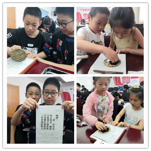 活動在學(xué)習(xí)兒童禮儀知識中拉開了序幕,志愿者老師為孩子們講授活字印刷術(shù)的文明歷史及發(fā)明歷程,讓孩子們對活字印刷術(shù)有基本了解。接著講解活字印刷術(shù)的制作過程,現(xiàn)場提問聲此起彼伏,對接下來的操作環(huán)節(jié)充滿了期待。在老師的指導(dǎo)下,孩子們用手中的工具開始制作,首先制成單字的陽文反文字模,然后按照自己需要的語句或文章把單字挑選出來,排列在字盤內(nèi),涂墨印刷。印完后再將字模拆出,留待下次排印時再次使用。一筆一墨一丹青,一紙一字一發(fā)明,看到自己親手制作的一首首古詩詞成品躍然紙上,孩子們露出滿意的笑容,迫不及待與朋友、家人分享。