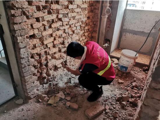 隨后和趕來的黃師傅、社區(qū)陳副書記共同查看了現(xiàn)場,黃師傅60多歲了,葉斌耐心地進(jìn)行勸說:“勝利一村是80年代的房子,主體架構(gòu)與現(xiàn)在的房子不能比,從安全的角度講,這種野蠻裝修引發(fā)的安全隱患不容小覷,墻體開裂后續(xù)甚至有坍塌的危險,不僅危及自身的安全,更是危及整棟樓的安全”。同時,網(wǎng)格員對現(xiàn)場情況進(jìn)行拍照取證,經(jīng)過網(wǎng)格員的開導(dǎo),戶主表示理解接受,也愿積極配合,請工人停止野蠻施工,按規(guī)定合理施工,將墻體恢復(fù)、加固,避免安全隱患。