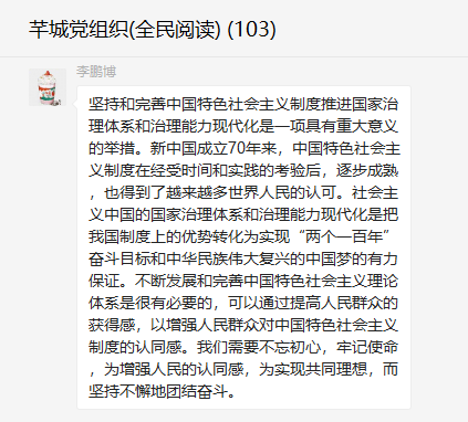 百水芊城社區(qū)依據(jù)街道黨工委部署制定本年度學習計劃,本月組織黨員線上點擊學習《堅持和完善中國特色社會主義制度推進國家治理體系和治理能力現(xiàn)代化》、《<中共中央關于堅持和完善中國特色社會主義制度、推進國家治理體系和治理能力現(xiàn)代化若干重大問題的決定>輔導讀本》,了解圍繞中國特色社會主義制度的生成邏輯與顯著優(yōu)勢,中國特色社會主義制度建設的歷史進程與基本經(jīng)驗,國家治理現(xiàn)代化與全球治理等要點,黨員們在學習后也紛紛暢所欲言,進一步明確了方向、增強了信心、強化了責任感和使命感。