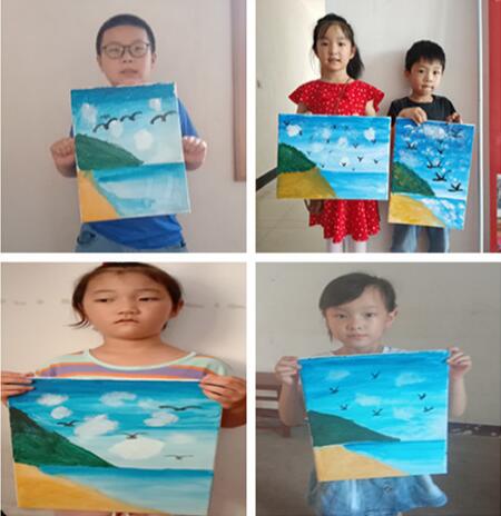 此時(shí)此刻,他們就像繪畫出的一幅水粉畫般,神情安然。孩子們按照順序畫好底色,繪上波浪,點(diǎn)上海鷗,在他們的巧手下,一幅幅美麗的作品就誕生了。
