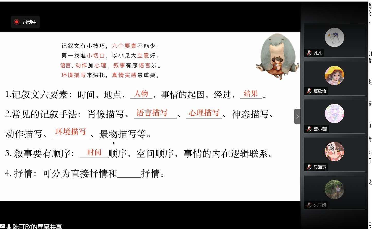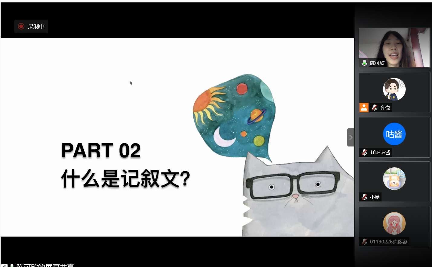 云朵課堂第四期特色課堂在下午三時(shí)許開(kāi)始,文欣青協(xié)的志愿者們提前進(jìn)入騰訊會(huì)議進(jìn)行設(shè)備調(diào)試。下午三時(shí)十分,特色課堂第一部分開(kāi)始,負(fù)責(zé)主講的志愿者賈梁同學(xué)向聽(tīng)課的學(xué)生提出“你知道的抗‘疫’模范有哪些”的問(wèn)題,與小朋友們開(kāi)麥互動(dòng),并給出兩個(gè)抗“疫”事例,帶領(lǐng)學(xué)生一起學(xué)習(xí)疫情之下身邊人的抗疫精神,并講述如何使寫(xiě)作不再像“流水賬”。第二部分由陳可欣同學(xué)主講,陳可欣同學(xué)給學(xué)生們講述記敘文的定義和記敘文六要素,并請(qǐng)學(xué)生們開(kāi)麥答問(wèn)題,巧妙將寫(xiě)作重心轉(zhuǎn)向疫情之下的“我們”。接著,陳可欣同學(xué)以文章《門(mén)外有回音》為例,講述記敘文寫(xiě)作的切口,并給學(xué)生們布置了小練筆作業(yè)。最后,主講人對(duì)前四次創(chuàng)意寫(xiě)作小課堂的內(nèi)容進(jìn)行了總結(jié),舉行了閉營(yíng)儀式。下午四時(shí)整,特色課堂全部結(jié)束,文欣青協(xié)的志愿者們與參與活動(dòng)的孩子們道別。