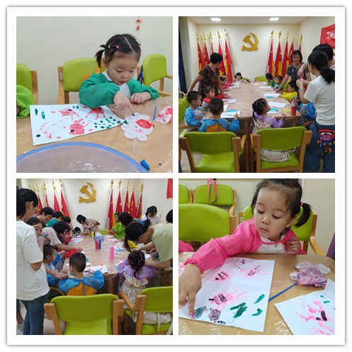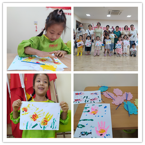 活動(dòng)在“上山打老虎”手指謠中拉開了序幕。“老師,你能給我講一下小雞球球的故事嗎?”課堂上,兩位社區(qū)志愿者正在為孩子們講解繪本故事,他們語(yǔ)言風(fēng)趣幽默,一來(lái)就和孩子們“打成一片”。此外,在“畫熱帶魚”環(huán)節(jié),孩子們迫不及待地把自己的小手上抹上顏料,用力印在紙上,各自發(fā)揮豐富的想象力,利用不同手印的外形特點(diǎn),添畫出各種不同生動(dòng)有趣的圖案。漸漸的,一條條有創(chuàng)意的“熱帶魚”便誕生了??吹胶⒆觽円粡垙垰g樂的笑臉,一位家長(zhǎng)樂呵呵地說(shuō):“孩子們放學(xué)來(lái)到這里,既能安全度過管理真空期,又學(xué)到了知識(shí),解決了我們的后顧之憂。”