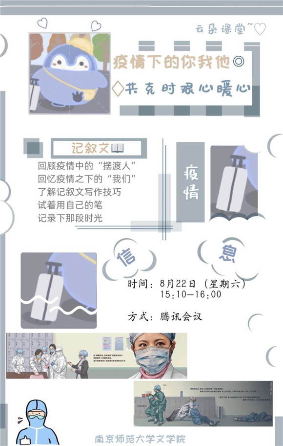 暑期期間,南京市棲霞區(qū)馬群街道百水芊城社區(qū)攜手南京師范大學(xué)文學(xué)院文欣青協(xié)“云朵課堂”暑期實(shí)踐團(tuán)隊(duì)共同開展了“妙筆生花寫童趣,云端相會(huì)共成長(zhǎng)”創(chuàng)意寫作線上課堂系列活動(dòng),暑期的四期寫作課堂通過騰訊會(huì)議在線上按計(jì)劃開展。
