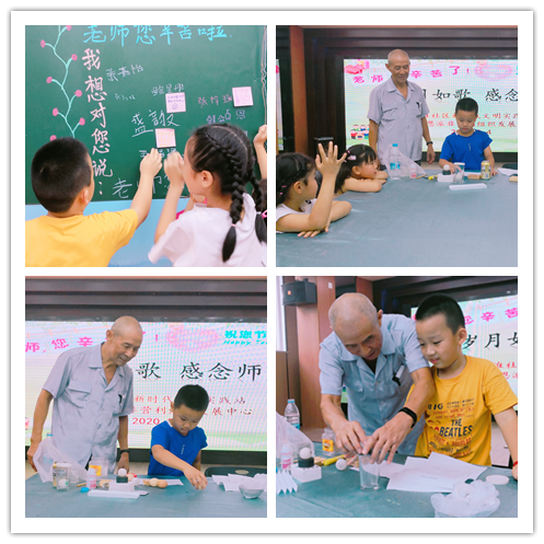 程老師是一位退休的物理教師,這次他為孩子們帶來了很多與生活有關的物理小實驗,耐心地進行演示和講解,每到精彩瞬間都贏得孩子們陣陣鼓掌的聲音。大家也興致勃勃地親手實驗起來,在程老師的指導和他們的共同努力下,一幕幕神奇的景象呈現(xiàn)在眼前,現(xiàn)場一片歡聲笑語?;顒拥母叱保⒆觽兒统汤蠋煼窒淼案?,祝全天下的老師教師節(jié)快日。