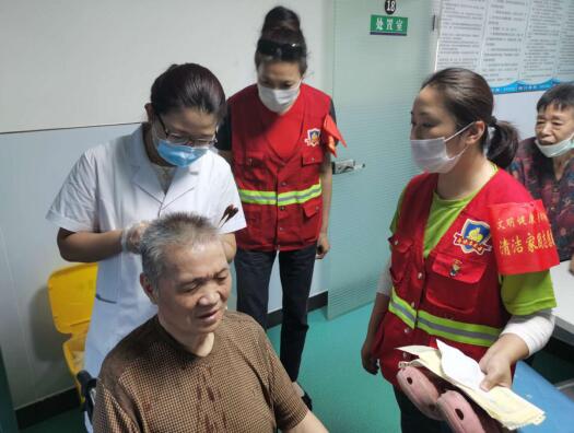 全科社工第一時間到達現(xiàn)場并立即用手機叫車軟件幫助老人叫了一輛車。因擔心老人發(fā)生不可知的狀況,隨后兩位敬老助殘志愿者協(xié)助家屬將老人攙扶下樓,一路護送到醫(yī)院,全程陪同老人急診就醫(yī)。同時聯(lián)系上老人住在市區(qū)的女兒,告知其老人現(xiàn)在受傷的狀況。在萬壽醫(yī)院做完一系列檢查和清創(chuàng)包扎后大家又一起將老人安全護送回家。