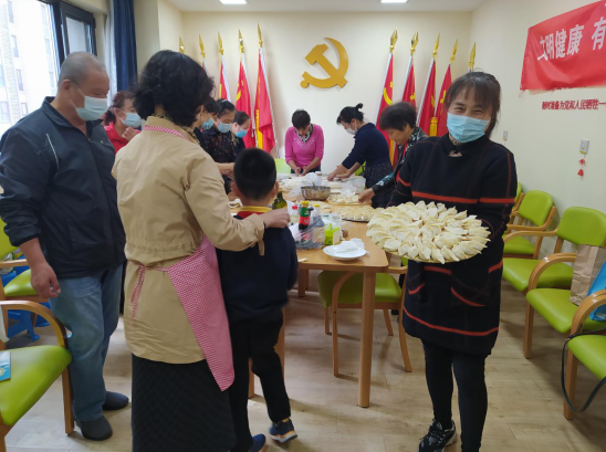 演出結(jié)束后,志愿者分組帶領(lǐng)老年人動(dòng)起手來,一起包“重陽”餃子。大家分工協(xié)作,和面、剁餡、搟餃子皮、包餃子。活動(dòng)現(xiàn)場社區(qū)的老年朋友們忙的不亦樂乎,邊包邊聊,歡聲笑語,其樂融融,氣氛熱鬧非凡。2個(gè)小時(shí)過后,一個(gè)個(gè)皮薄餡大的餃子擺滿了桌子,大家邊聊家常邊交流著包餃子的手法,現(xiàn)場氣氛溫馨快樂。