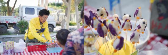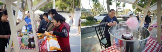 “好吃又好看的點(diǎn)心,過(guò)來(lái)嘗一嘗,看一看啊……”循聲望去,南京粽子叔叔的攤位前已經(jīng)擠滿了一個(gè)個(gè)眨巴著眼睛的孩子,這邊孩子們還沒(méi)掏出錢,“棉花糖,棉花糖,新鮮出爐的棉花糖……”又被旁邊的棉花糖吸引過(guò)去,在一聲聲此起彼伏的叫賣聲中,彭福村的鄰里集市正式拉開(kāi)了帷幕。