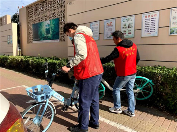 活動(dòng)過程中,穿著藍(lán)馬甲的志愿者和穿著紅馬甲的社區(qū)工作人員有的在河道邊撿拾堆積的塑料袋、塑料瓶、廢紙等垃圾,有的清理、挪動(dòng)道路旁亂停的自行車和電動(dòng)車,還有的則撿拾小區(qū)內(nèi)綠化帶中的垃圾。為了改善社區(qū)內(nèi)的環(huán)境衛(wèi)生,大家不怕臟不怕累,很快,草地上的垃圾就不見了,路邊停的非機(jī)動(dòng)車也變得十分整潔有序。