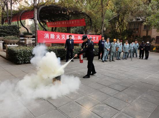 接著消防特勤示范了滅火器的使用方法,在使用滅火器滅火時,要對準火焰底部,并且盡量站在上風口,避免引火上身,操作時要記住“一拔二瞄三壓”。最后物業(yè)工作人員和部分居民一一上臺演練。