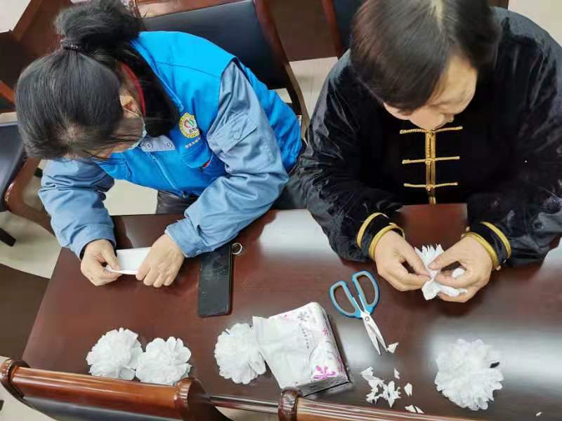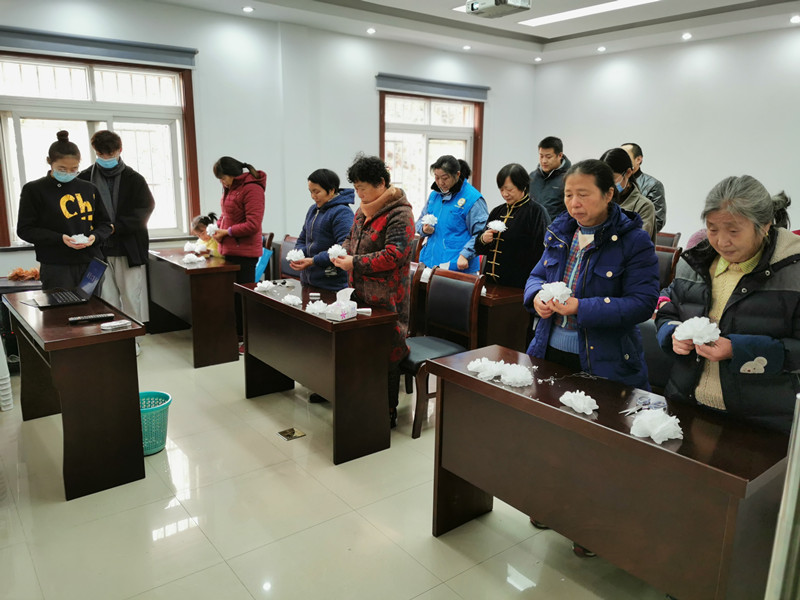 隨后,志愿者教居民們手工制作了小白花,一張張潔白的紙張?jiān)诰用竦氖种胁灰粫?huì)兒就變成了一朵朵圣潔的白菊花,表達(dá)了對(duì)南京大屠殺罹難者的悼念與哀思。10:01分,防空警報(bào)拉響,居民們手捧白花低頭默哀。