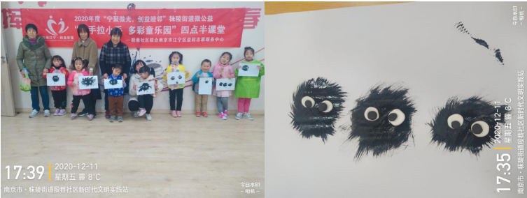 本次活動(dòng)在合唱 《Santa Claus is Coming to Town》中拉開(kāi)了序幕?,F(xiàn)場(chǎng),社區(qū)志愿者給小朋友們配發(fā)彩紙、雙面膠等工具,并手把手地指導(dǎo)小朋友們剪紙和粘貼“戒指”的方法。孩子們一會(huì)兒專(zhuān)注于自己制作的“戒指”作品,一會(huì)兒向身旁的小朋友討教“戒指”的制作方法,盡情地沉醉在小小“戒指”的世界中,看著自己親手制作的作品,孩子們相互展示,享受著成功的喜悅。此外,本來(lái)周五計(jì)劃只做戒指的,但考慮到小朋友還小,不能用熱膠棒,怕太無(wú)聊了,就又增加了一個(gè)牙刷畫(huà)環(huán)節(jié),畫(huà)的是日本《龍貓》里的灰塵精靈。最終孩子們懷揣著收獲的喜悅,將熱膠棒帶回家,讓家長(zhǎng)在家?guī)兔潭?ldquo;戒指”,便于保存,讓“戒指”真正“一顆永流傳”。