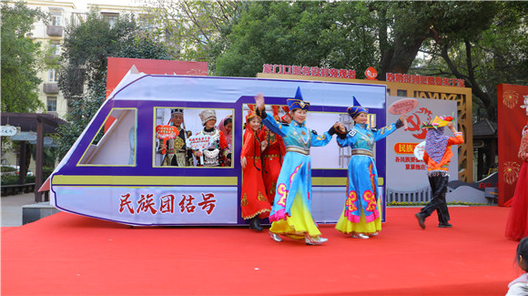 據(jù)悉,國慶期間一輛以“中華民族一家親,同心共筑中國夢”為主題的“民族團結(jié)號”有軌電車在南京市建鄴區(qū)青奧軸線亮相,成為“民族團結(jié)”主題教育移動基地。為展現(xiàn)各民族團結(jié)、攜手奮進的美好畫面,活動當天,幾十位身穿各民族服飾的演員們乘坐著“民族團結(jié)號”模型出現(xiàn)在舞臺,為轄區(qū)居民群眾帶來一場視聽盛宴。