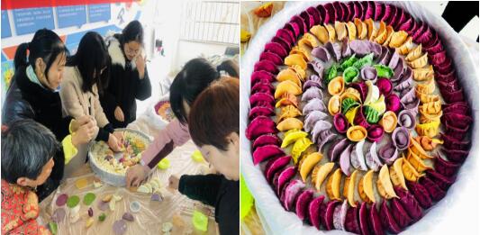 上午九點,活動室內(nèi)喧囂熱鬧,滿滿的人間煙火味。走進一看,發(fā)現(xiàn)社區(qū)村民們在洗菜、切菜、和七彩餃面、拌餡、包餃子,忙的熱火朝天,他們分工協(xié)作、個個動作嫻熟,不一會一個個形狀多異、色彩鮮艷、皮薄餡大的餃子在大伙的巧手之下擺滿了整個盤子,現(xiàn)場其樂融融,到處洋溢著幸福、甜美的“家”的味道。