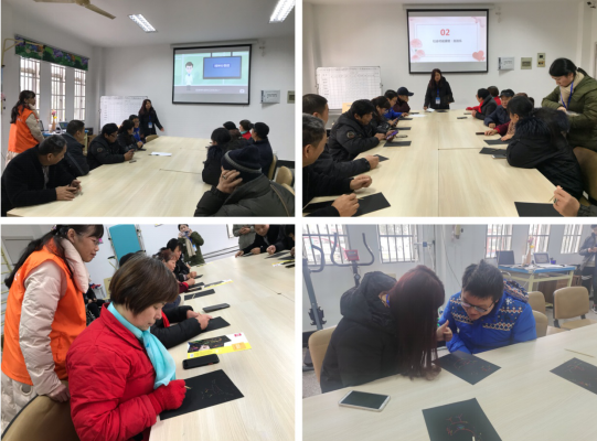 活動開始,志愿者通過小視頻帶領(lǐng)殘友們了解“精神分裂癥”的含義、以及精神分裂癥對日常生活的影響和精神分裂癥的有效治療方式,并鼓勵大家給予“精神分裂癥”人群關(guān)心和呵護。活動還準備了“刮刮樂”和“神秘的力量”等小游戲。“刮刮樂”,是一種新型的繪畫方式。學(xué)習刮畫的過程中,包含了視覺搜索、選擇、分配等能力,對于精神殘疾人而言是一項不錯的練習??吹?ldquo;黑紙”變成“彩色畫”,大家都驚嘆很神奇。有的殘友越刮越來勁,直到將一整張畫紙刮出了色彩鮮明的方格圖。有一位殘友用手中的竹簽筆在畫紙上寫道“希望我們每一位殘疾人都能開心快樂度過每一天”。不一會兒功夫,多姿多彩的圖畫作品就如魔術(shù)般躍然紙上。大家?guī)缀醵疾患s而同地在畫中表達了對彼此的美好祝愿。接著進行“神秘的力量”,大家對心理暗示都感覺到非常好奇?;顒幼詈?,志愿者帶領(lǐng),每位殘友都握緊拳頭,放在胸前,一起喊出口號:“我是一個積極進取的人!”“我是一個勇敢的人!”“我是最棒的!”說完后,大家臉上都呈現(xiàn)出了一定的自信和氣勢。
