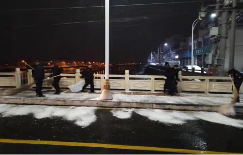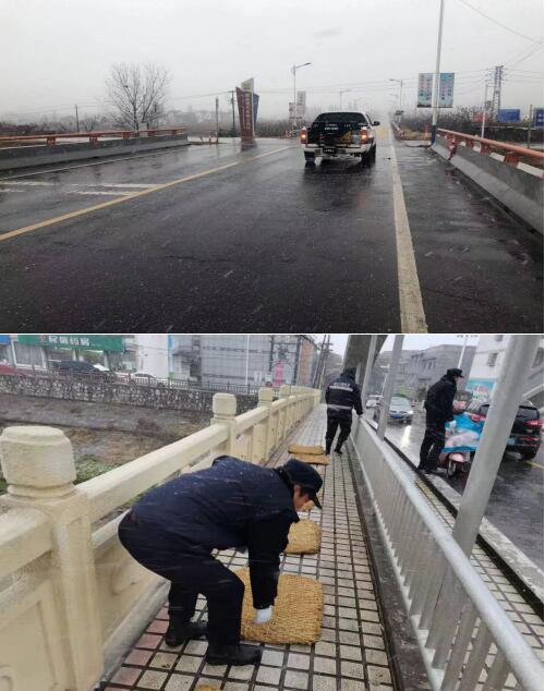 29日下午至夜間,雨雪紛紛,氣溫驟降。執(zhí)法大隊采取“人工+機械”相結(jié)合的方式,持續(xù)對轄區(qū)內(nèi)主干道、橋梁等重點區(qū)域撒布融雪劑、鋪設(shè)防滑草墊,防止道路結(jié)冰,保障轄區(qū)居民出行安全。
