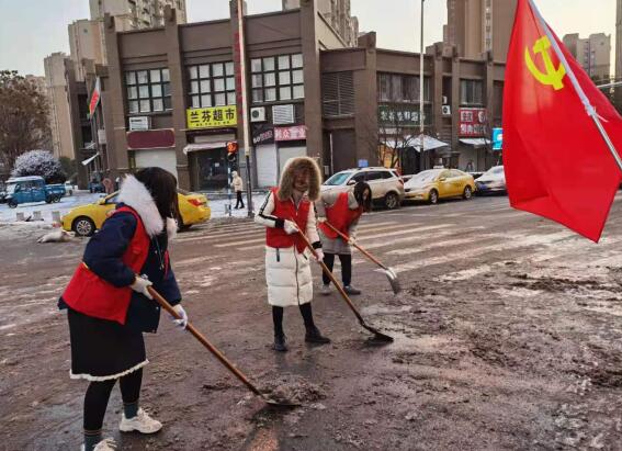 氣溫驟降,飄雪漸至,黨員、志愿者、物業(yè)工作人員持續(xù)忙碌著,躬著身子,拿著掃帚、鐵鍬,一鏟一掃的清理路上的積雪。社區(qū)黨員帶頭行動(dòng)直到凌晨,清除了小區(qū)門(mén)口的積雪,并在所有路口撒鹽,確保轄區(qū)居民正常出行。