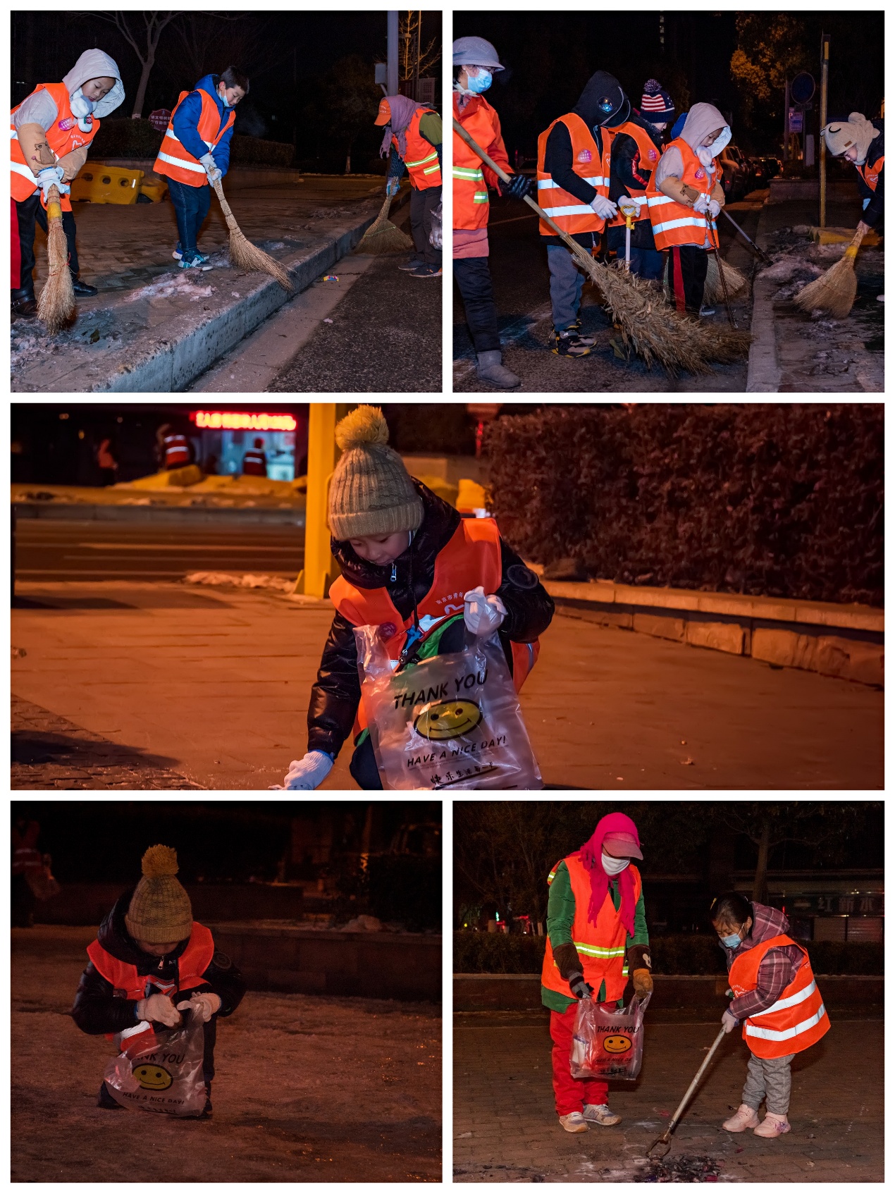 凌晨五點(diǎn),當(dāng)薄雪籠罩的南京尚未蘇醒時(shí),“城市美容師”們不俱寒冷,在刺骨的寒風(fēng)里穿梭勞動(dòng),“寧愿一人臟,換來萬家凈”。另一邊燈火昏明的室內(nèi),小志愿者們第一次見到凌晨五點(diǎn)的南京,他們冒著刺骨的寒風(fēng),走出家門,來到街道,親眼了解到一直以來他們覺得時(shí)刻干凈清爽的街道背后原來是環(huán)衛(wèi)工人們頂著寒風(fēng)默默辛勤勞作的成果。