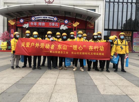 為了切實(shí)幫助戶外勞動(dòng)者解決生產(chǎn)生活方面的實(shí)際困難,將社區(qū)、社會(huì)對(duì)于戶外勞動(dòng)者的關(guān)懷與關(guān)愛(ài)送到他們的心坎上,1月5日,江寧區(qū)東山街道總工會(huì)、東山社區(qū)新時(shí)代文明實(shí)踐站在江寧萬(wàn)達(dá)開(kāi)展以“關(guān)愛(ài)戶外勞動(dòng)者 東山‘暖心’在行動(dòng)”為主題的活動(dòng)。
