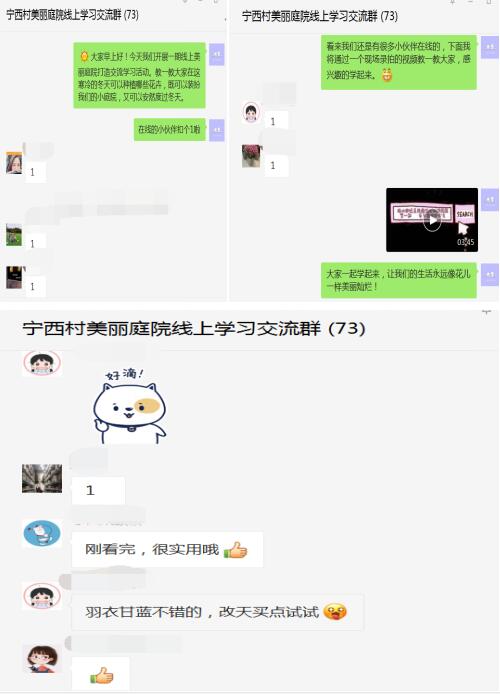 在學(xué)習(xí)交流群中,工作人員把提前錄制好的視頻發(fā)送給大家。跟隨工作人員的視角,居民們來(lái)到南京最大的花卉市場(chǎng)——江寧臺(tái)創(chuàng)園,里面五彩斑斕、品種多樣的花草樹木讓人應(yīng)接不暇,恍惚間還以為置身春天。隨后,工作人員向大家介紹了冬季容易存活的花卉,如三色堇、角堇、礬根、報(bào)春花、羽衣甘藍(lán)等品種,并詳細(xì)地講解各類花卉的種植場(chǎng)景和養(yǎng)護(hù)方法,增進(jìn)了大家對(duì)冬季種植的了解;其中“羽衣甘藍(lán)”深受大家喜愛,有居民表示要在課后嘗試種植。