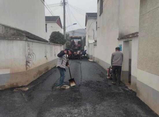 前期,為了提升村莊的污水處理能力,改善村莊的環(huán)境,湖山村對(duì)于村莊內(nèi)的污水管網(wǎng)進(jìn)行了重新規(guī)劃,道路因?yàn)楣芫W(wǎng)的改造變得坑坑洼洼。湖山村借此契機(jī),將全村道路鋪上柏油路。由于鋪設(shè)工程量較大,湖山村志愿者們將手拿鐵鍬、鏟子、鋤頭等勞動(dòng)工具在鋪油機(jī)、壓路機(jī)等大型修路設(shè)備來(lái)回穿梭。寒冷的冬日,志愿者揮汗如雨,有條不紊地進(jìn)行道路鋪設(shè),在大家的辛勤勞作下,一條條黝黑锃亮的柏油馬路鋪設(shè)完成。