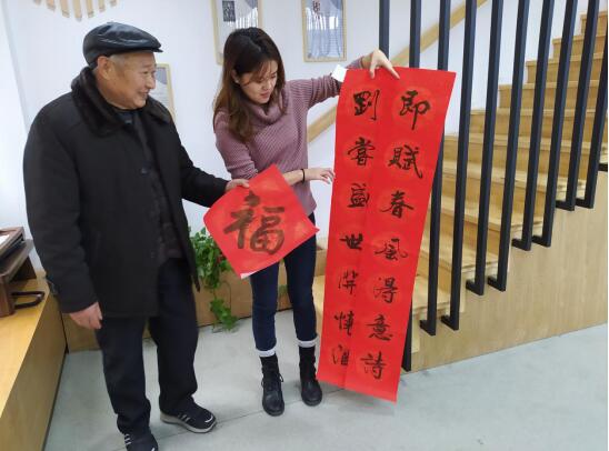 過新年、送福字、貼春聯(lián)是中華民族的傳統(tǒng)文化,是象征吉祥、表達(dá)人們向往美好生活的民族風(fēng)俗。在社區(qū)黨群服務(wù)站,只見桌上鋪滿了喜氣的大紅紙,張廣立老師鋪開紙硯,筆酣墨香,龍飛鳳舞,一幅幅喜慶的對聯(lián)承載著滿滿的祝福,在他的手中隨筆而出??瑫?、隸書、行書、草書等作品風(fēng)格迥異,各具神韻,讓大家充分領(lǐng)略到書法藝術(shù)經(jīng)久不衰的魅力。