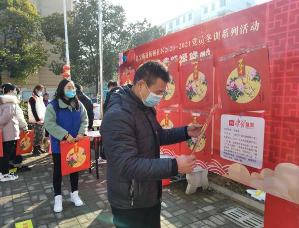 “咦,領(lǐng)走福袋后,展板上還有字!”“是學(xué)習(xí)強(qiáng)國(guó)積分榜,看看、看看……”新銅社區(qū)結(jié)合黨員冬訓(xùn)活動(dòng),準(zhǔn)備了300份福袋,免費(fèi)讓居民領(lǐng)取。社區(qū)在福袋展板上暗藏小玄機(jī),把學(xué)習(xí)強(qiáng)國(guó)積分榜及黨員分享的“一件事”、“一句話”隱藏在福袋后,領(lǐng)取福袋時(shí)看到社區(qū)黨員們的學(xué)習(xí)趣事、模范事跡以及祝福寄語(yǔ),讓領(lǐng)?;顒?dòng)更有層次感和儀式感,同時(shí),把黨的聲音、社區(qū)的關(guān)懷傳遞到居民身邊。