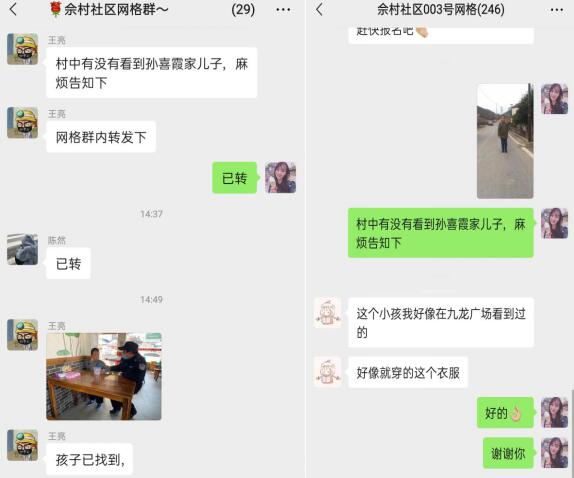 下午兩點(diǎn),江寧區(qū)東山街道佘村社區(qū)網(wǎng)格員陳然和佘德勝在社區(qū)警網(wǎng)融合工作室辦公,居民孫喜霞哭著向網(wǎng)格員求救“求求你們,快幫我一起找找孩子吧”!原來居民孫喜霞的5歲的兒子在社區(qū)景點(diǎn)玩耍,因家長疏忽大意走失,請求網(wǎng)格員協(xié)助。網(wǎng)格長王亮知曉此事,立即帶領(lǐng)網(wǎng)格員們前往事發(fā)地,在獲悉走失兒童的基本信息、體貌特征后,網(wǎng)格員立即聯(lián)系社區(qū)“智網(wǎng)工程”指揮調(diào)度工作站、佘村社區(qū)警網(wǎng)融合工作站請求協(xié)助,同時(shí)將走失兒童的相片和視頻發(fā)送至轄區(qū)各個(gè)微信群,呼吁群眾協(xié)助尋找。