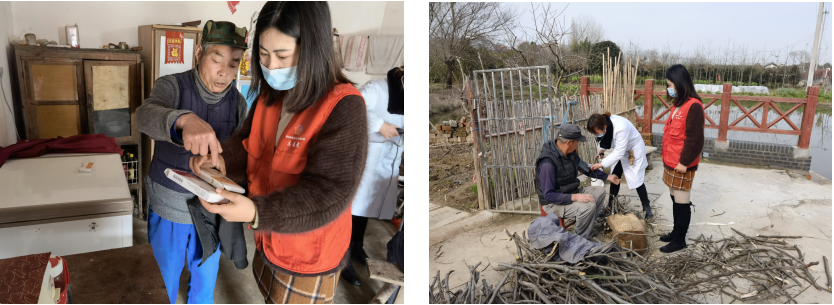 當(dāng)天,志愿者們挨家挨戶(hù)上門(mén)拜訪(fǎng)社區(qū)中的特困供養(yǎng)老人,為他們送去飽含關(guān)懷的慰問(wèn)和一些治療基礎(chǔ)病癥的藥物。志愿者認(rèn)真地為每一位特困供養(yǎng)老人測(cè)量血壓,進(jìn)行基礎(chǔ)的健康檢查,并根據(jù)測(cè)量結(jié)果,為他們提出科學(xué)的生活指導(dǎo)和診療建議,將老人的健康情況一一記錄在冊(cè)。為了讓老人們擁有更加舒適整潔的居住環(huán)境,志愿者們?yōu)槔先藥兔φ砹思覄?wù),掃地、抹灰、擦窗,不怕臟、不怕累。在志愿者的清理打掃下,老人的家煥然一新。針對(duì)一些行動(dòng)不便的老人,志愿者們更是自發(fā)地為他們砍柴,幫助減少他們勞動(dòng)上的困難,熱心體貼的服務(wù)得到了老人們的連聲感謝。