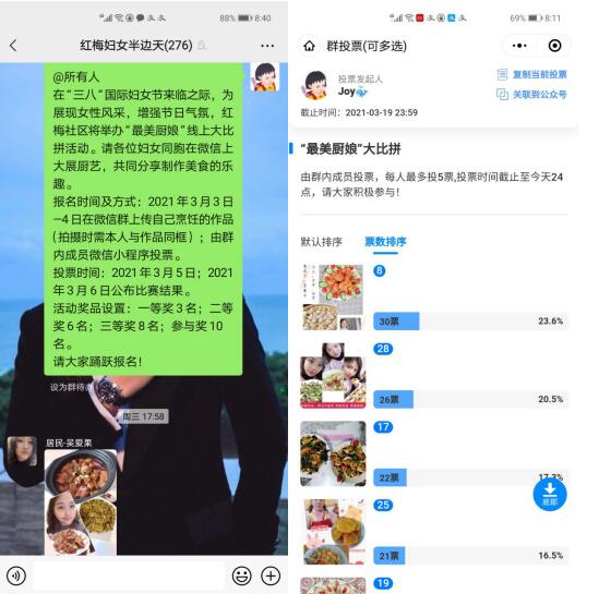 活動期間,紅梅社區(qū)充分利用微信群等線上交流溝通的陣地,開展“最美廚娘”大比拼,轄區(qū)婦女群眾踴躍報名,線下大展廚藝,線上積極分享,共同交流制作美食的經驗。一張張圖片、一個個美食,讓默默在群里圍觀的看客們垂涎欲滴。