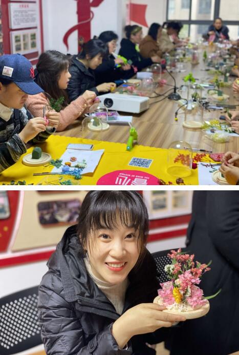 永生花也叫保鮮花、生態(tài)花,國(guó)外又叫“永不凋謝的鮮花”。永生花是使用玫瑰、康乃馨,蝴蝶蘭,等品類的鮮切花,經(jīng)過(guò)脫水、脫色、烘干、染色等一系列復(fù)雜工序加工而成的干花。是花藝設(shè)計(jì)、居家裝飾、慶典活動(dòng)最為理想的花卉深加工產(chǎn)品。婦女們充分發(fā)揮自己的智慧和匠心,從造型的創(chuàng)意、素材的選取、顏色的搭配、作品名字的選取,每個(gè)環(huán)節(jié)都是靈感、個(gè)性、情感的展現(xiàn)。時(shí)間在指尖流淌,精美雅致的作品在老師的指導(dǎo)下一一呈現(xiàn)在大家的面前。完成后,大家紛紛欣賞起自己的作品并拍照分享。笑顏如花,定格在這美好的時(shí)刻。