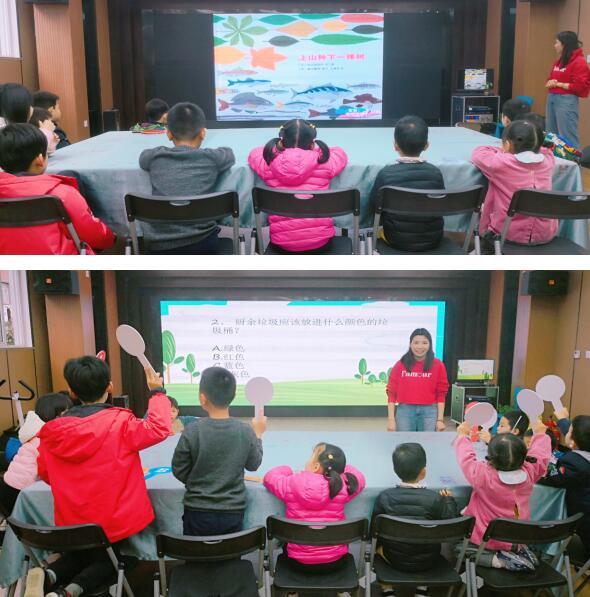 現(xiàn)場,繪本閱讀老師和孩子們分享繪本《山上種下一棵樹》。這是一本嚴謹?shù)膬和L本,充滿了大量的知識點,卻能用生動的圖案和簡潔的文字串聯(lián),看起來毫不吃力。老師用簡潔流暢的敘述方式描述,從樹梢到土壤,從山巒到大海,多姿多彩的生態(tài),就從種下一棵樹開始……為孩子們編織了一個充滿生命力的自然循環(huán)之環(huán)。書的內(nèi)容很豐富,講了大自然的循環(huán),其實我們保護環(huán)境,環(huán)境會以某種方式回饋給我們?nèi)祟?。借此契機老師引導(dǎo)孩子們參加了一場別開生面的垃圾分類知識競賽。隨著題目的播放,孩子們踴躍舉手,爭先恐后上臺回答問題,回答有誤的,現(xiàn)場耐心給予糾正,并告知錯誤原因,加深記憶。