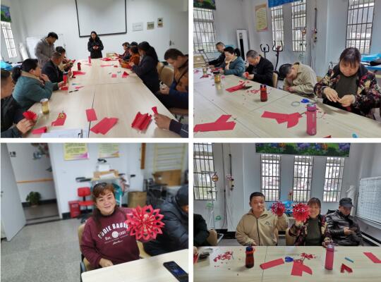 活動開始,志愿者老師給殘友們講解了剪紙在我國的悠久歷史和含義,使大家對剪紙藝術(shù)特色有大概的了解,在剪紙中感受到細微變化帶來的巨大差異,感受到剪紙的樂趣?;顒舆€準(zhǔn)備了“心隨手動”和“憤怒的畫家”等小游戲。在“心隨手動”游戲中,殘友們在志愿者老師的指導(dǎo)下用剪刀慢慢的剪,他們有條不紊地上下翻折著手中的彩紙,時而低頭思考,時而又拿起來仔細地對照著圖樣,神情十分專注。雖然學(xué)習(xí)剪紙的過程中遇到一些困難,有的人嘗試了兩次都不小心剪壞了形狀,但是,他們并沒有就此放棄。每個人都剪出了獨一無二的雪形窗花。