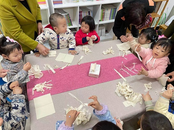 活動(dòng)中,中心老師引導(dǎo)家長(zhǎng)、幼兒進(jìn)行了熱身活動(dòng)“魔袋尋寶”,組織大家通過(guò)“拉紅繩”的形式進(jìn)行分組,相互分工合作,很快就找到“寶藏”并順利完成任務(wù)。熱身游戲后的“手工剪紙做手工”環(huán)節(jié),志愿者為所有幼兒派發(fā)彩紙、剪刀、膠水等工具,并逐一示范每個(gè)操作步驟,“上下對(duì)折、左右對(duì)折、沿著虛線折......”幼兒們聽(tīng)得格外認(rèn)真,個(gè)個(gè)都是躍躍欲試、大顯身手的模樣,迫不及待地?cái)[弄起手中的彩紙。在志愿者和家長(zhǎng)的幫助下,幼兒們順利完成了自己的作品,自豪地向小伙伴炫耀起來(lái)?;顒?dòng)的最后,家長(zhǎng)們跟著老師的指令帶著孩子們做起身體運(yùn)動(dòng),隨著歡樂(lè)的音樂(lè),拍拍手、跺跺腳,轉(zhuǎn)圈圈…孩子們都開(kāi)心極了,臉上洋溢著快樂(lè)的笑容。