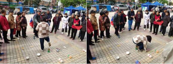 賽場上老人們興致高昂、各顯身手,現(xiàn)場氣氛熱鬧非凡?;顒娱_始前,社工帶著老人們做起熱身運(yùn)動,大家一起伴隨著音樂活動著筋骨。趣味運(yùn)動環(huán)節(jié),根據(jù)老年人的年齡和身體狀況,設(shè)置了投壺和套圈兩個項(xiàng)目。投壺比賽中,老人們躍躍欲試,現(xiàn)場也隨著命中情況,感慨著、歡呼著、惋惜著……另一邊的套圈場地,“老小孩”們個個身手矯健,有順序的排著隊(duì),互相攙扶,互相加油,到處洋溢著談笑聲、歡呼聲和此起彼伏的加油聲,氣氛熱烈而融洽。