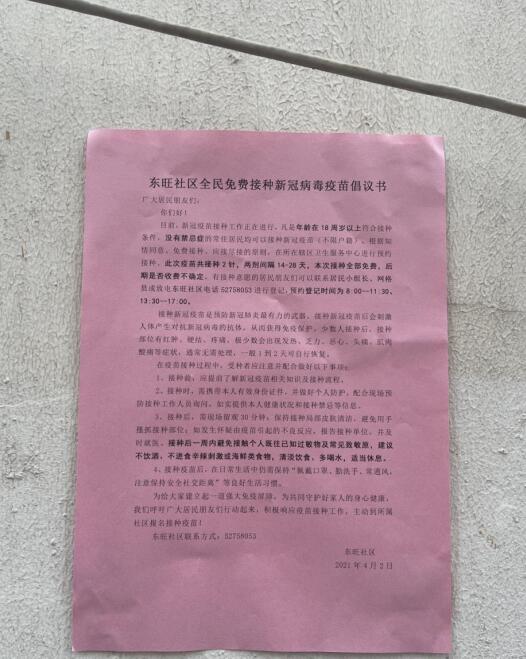 一是在東旺社區(qū)網(wǎng)格內(nèi)各處張貼新冠疫苗接種宣傳和相關(guān)通知;在宣傳欄張貼海報(bào),就接種人群要求、接種新冠疫苗應(yīng)注意的事項(xiàng)等進(jìn)行科普宣傳;網(wǎng)格員和村長(zhǎng)一對(duì)一進(jìn)行入戶(hù)走訪(fǎng),宣傳接種疫苗,及時(shí)做好村民疫苗接種登記預(yù)約,為居民提供更加人性化的特色便民服務(wù),全力保障接種點(diǎn)的接種工作順利進(jìn)行。