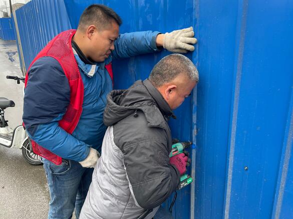 社區(qū)接到電話后第一時(shí)間組織社區(qū)工作人員帶上工具前往現(xiàn)場(chǎng),發(fā)現(xiàn)部分圍擋出現(xiàn)被風(fēng)吹倒、傾斜、人為破損等現(xiàn)象,給出行的車輛和行人造成安全隱患。針對(duì)圍擋存在的問(wèn)題,工作人員多措并舉,根據(jù)圍擋的類型、材質(zhì)、大小以及破損的程度等情況采取相應(yīng)的處理方法。一是利用鐵絲、扳手、老虎鉗等工具對(duì)輕微處進(jìn)行修補(bǔ),共修復(fù)5處。二是對(duì)嚴(yán)重破損的直接清除,并對(duì)圍擋加固,及時(shí)消除安全隱患,保障廣大居民的出行安全。