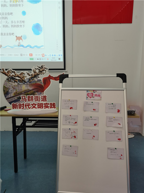 活動(dòng)現(xiàn)場(chǎng),志愿者們組織小朋友們學(xué)唱《我的好媽媽》。稚嫩而響亮的歌聲,一遍遍在活動(dòng)室內(nèi)回蕩,讓大家沉浸在感恩母愛的濃厚氛圍之中。隨后,孩子們手寫賀卡,將最誠(chéng)摯的祝福送給媽媽,又在志愿者的指導(dǎo)下制作愛心捧花送給媽媽,并和媽媽來(lái)一個(gè)緊緊的擁抱,讓很多媽媽感動(dòng)得久久說(shuō)不出話來(lái)。