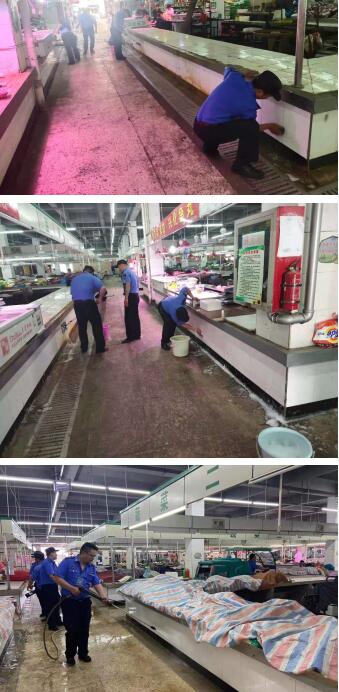 近日,執(zhí)法大隊(duì)按照“一周一清潔、一月一大掃除”的工作模式,組織人員使用掃帚、抹布、灑水車等工具對(duì)轄區(qū)內(nèi)各農(nóng)貿(mào)市場(chǎng)內(nèi)地面、柜面、墻壁、下水道等區(qū)域存在的污漬、雜物進(jìn)行集中清理,確保整治“全覆蓋、無死角”。天氣雖然悶熱,仍擋不住隊(duì)員們的勞動(dòng)熱情,通過執(zhí)法隊(duì)員的共同努力,轄區(qū)內(nèi)農(nóng)貿(mào)市場(chǎng)衛(wèi)生環(huán)境煥然一新,得到了廣大居民的一致好評(píng)。