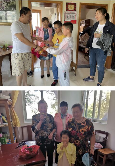 隨后,志愿者們各自分組領(lǐng)著親子家庭帶著香粽香囊進(jìn)行上門慰問。“程奶奶,端午節(jié)快到了,祝您端午節(jié)快樂啊!小區(qū)現(xiàn)在開展三全家庭教育支持行動,孩子們跟隨我們一起來給您送粽子和香囊。”獨(dú)居老人程桂英老奶奶看到端木銘熙小朋友的到來,驚訝、興奮地雙手捂著嘴不住地表示感謝;癱瘓?jiān)诖驳慕棠炭吹街驹刚呒昂⒆觽兊奈繂?,流下了高興地淚水;因眼部殘疾看不見的湯寶玉伯伯用手觸摸孩子們送的粽子香囊,激動地說不出話來;獨(dú)居退伍老兵楊志才老人拄著拐杖目送志愿者及孩子們,眼神中流露出激動目光......
