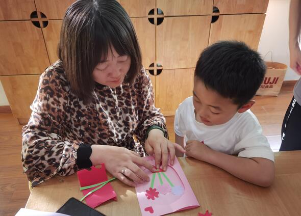 活動中小朋友在挑選了自己喜歡的材料后,有的用卡紙折疊,剪出弧度,再分別粘貼,有的用彩色水筆寫上對媽媽說的話。在志愿者的指導下,小朋友們充分發(fā)揮想象力,用靈巧的雙手繪制出了一張張精美的賀卡。