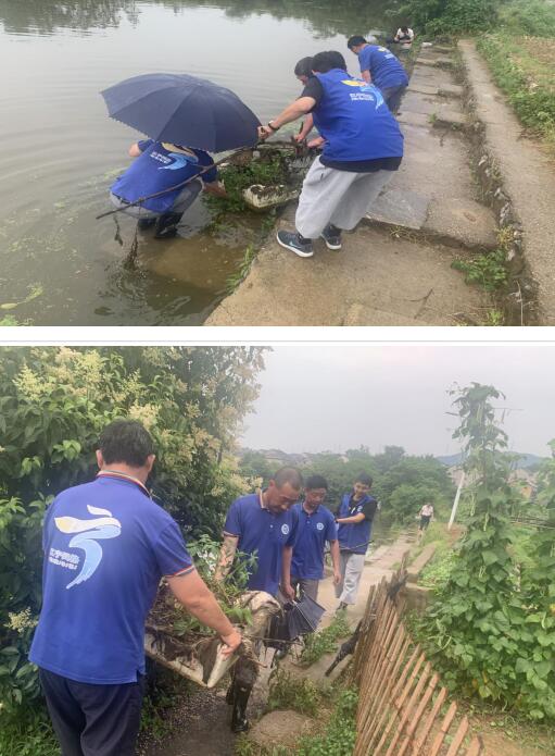 在巡查過(guò)程中,網(wǎng)格員們發(fā)現(xiàn)池塘上有被雨水沖擊下來(lái)的漂浮物,于是,網(wǎng)格員們立刻來(lái)到池塘邊對(duì)其進(jìn)行打撈清理并提醒塘邊居民注意安全。