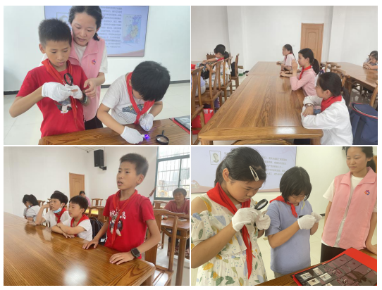 本次活動(dòng)中,以一方小小郵票為載體,將百年黨史串珠成線讓黨史學(xué)習(xí)教育更接地氣、更具吸引力。志愿者對(duì)應(yīng)郵票講述國(guó)共第一次合作、大革命、“星星之火,可以燎原”、紅軍反圍剿的歷史故事,并現(xiàn)場(chǎng)讓孩子們依次上臺(tái)觀摩趙世炎、何叔衡等歷史名人郵票。孩子們習(xí)慣的套上白手套,神情專注地用鑷子和放大鏡仔細(xì)觀看,感悟革命精神。