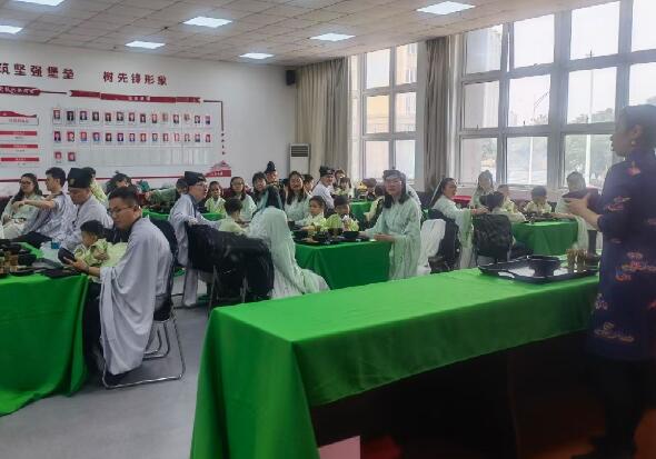 社區(qū)居民更換了服裝,仿佛穿越到千年的宋朝。李老師為大家講解古禮,學(xué)習(xí)點茶技藝。孩子們按耐不住興奮之情,自己動手開始點茶,用茶筅、建盞、盞托等器具點出泡沫細膩的茶湯,給父親奉上一杯自己親手點的茶,茶淺意濃,滿滿都是關(guān)于愛的表達。