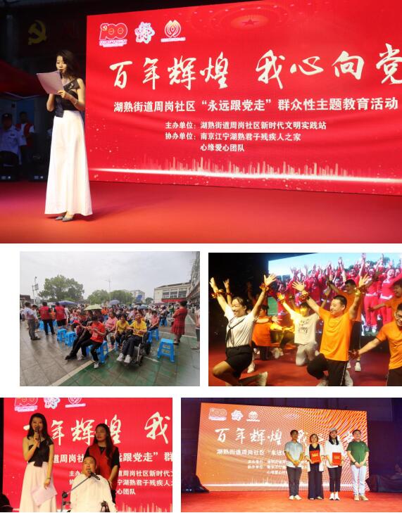6月26日晚,由湖熟街道周崗社區(qū)新時(shí)代文明實(shí)踐站、心緣愛心團(tuán)隊(duì)及湖熟街道君子殘疾人之家聯(lián)合主辦,以百年輝煌 我心向黨——“永遠(yuǎn)跟黨走”群眾性教育活動(dòng)為主題的活動(dòng),在周崗社區(qū)黨群服務(wù)中心隆重開展。原江寧區(qū)民政局局長(zhǎng) 江寧區(qū)善總會(huì)副會(huì)長(zhǎng) 畢書宏、江寧區(qū)慈善總會(huì) 副秘書長(zhǎng) 陶象銀、江寧區(qū)殘聯(lián)(兼職)副理事長(zhǎng) 陳沛然、湖熟街道辦事處副主任 趙宏國(guó)、湖熟街道殘聯(lián)理事長(zhǎng)李紅梅、周崗社區(qū)黨總支書記 陳武、周崗社區(qū)黨總支副書記 楊平等領(lǐng)導(dǎo)出席?,F(xiàn)場(chǎng)特邀央視開門大吉簽約歌手-劉德華電影御用替身演員 歌手教海嘩、星光大道冠軍劉奕辰 等明星現(xiàn)場(chǎng)助陣。抗戰(zhàn)老兵、70年黨齡的優(yōu)秀老黨員、殘疾人家屬、扶殘助殘企業(yè)代表、愛心人士、社區(qū)居民及志愿者等幾百人冒雨堅(jiān)持參加完全場(chǎng)活動(dòng)。同時(shí),周崗派出所、湖熟交警中隊(duì)、周崗社區(qū)衛(wèi)生服務(wù)中心、湖熟電力公司的工作人員也挺立在雨中,保證每一個(gè)活動(dòng)參與者的人身安全,為活動(dòng)的順利開展保駕護(hù)航。