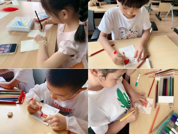 畫好卡紙,老師幫孩子們加熱塑封,原樣返還,“爸爸,怎么才能把流蘇串到書簽上去呀?”一個(gè)正準(zhǔn)備裝飾書簽的小女孩遇上了難題。在家長(zhǎng)的幫助下,她順利戳開(kāi)小孔,串上了自己喜歡的裝飾品。